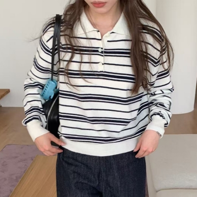 on.[NT718]스트라이프카라넥버튼니트